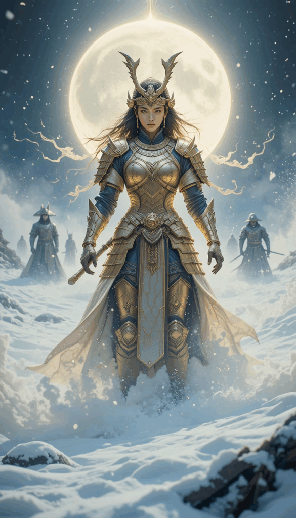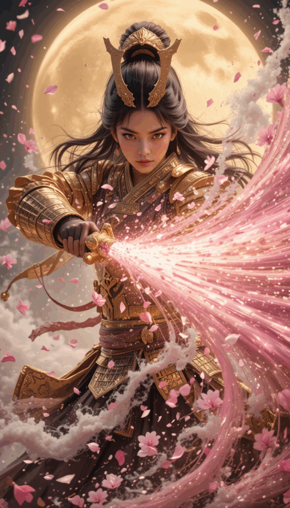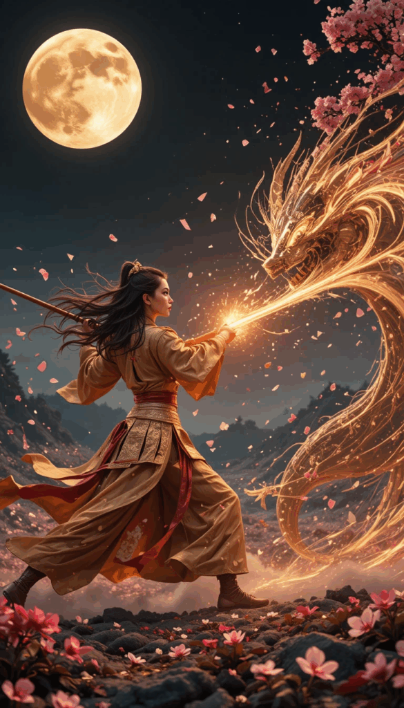 A fierce yet graceful warrior stands beneath the full moon, her golden armor shining like divine fire. The spirit of the Japanese dragon coils behind her, symbolizing courage, purity, and destiny. This scene captures the sublime emotion of Bushidō—discipline, elegance, and unshakable resolve. A tribute to every woman who rises, protects, and transforms her own path.”