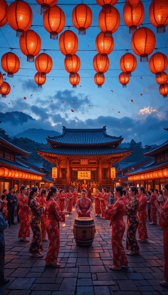 Step into the golden glow of Kyoto’s Bon Odori — a festival that unites hearts through dance, music, and lantern light. Beneath the moonlit sky, dancers in vibrant yukata gather around the yagura, their hands and steps moving in harmony with taiko rhythms that echo through the summer night. The scent of evening blossoms drifts through temple streets, and each turn of the dance honors the spirits of those who came before. Bon Odori is not just a celebration — it’s a living memory of Japan’s enduring soul, where joy, reverence, and beauty merge in timeless light.
