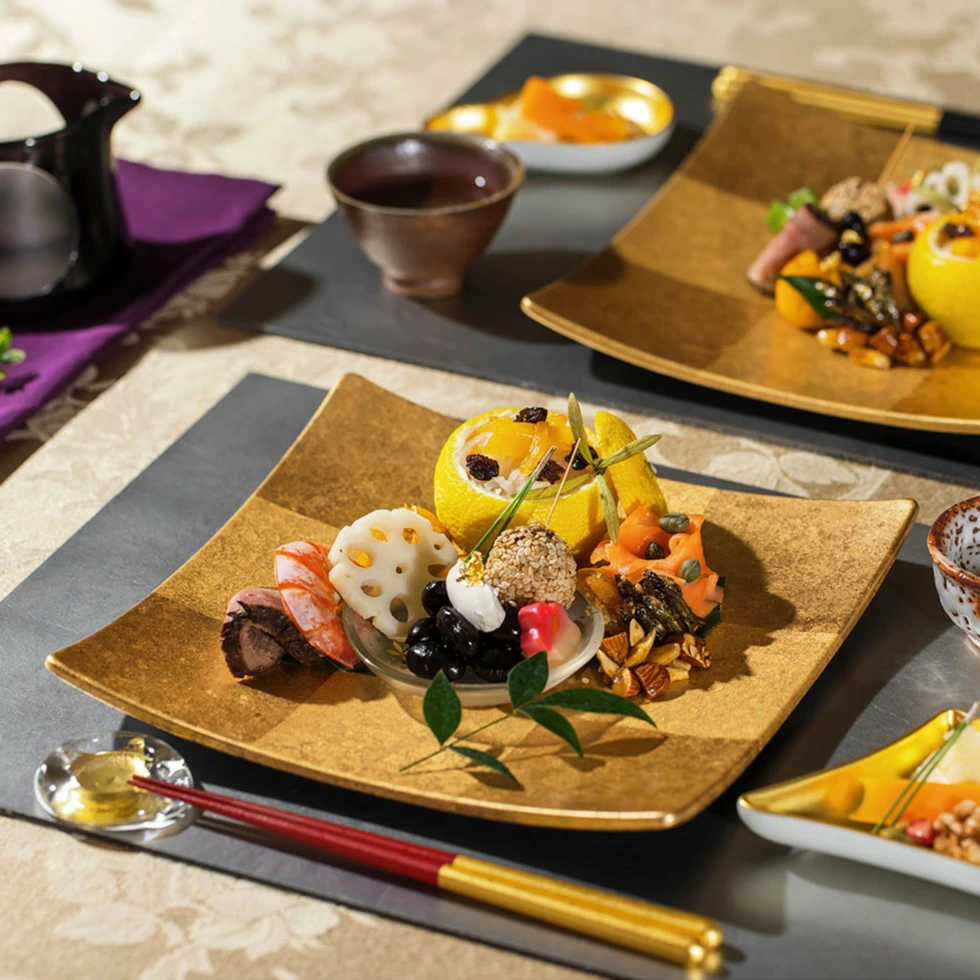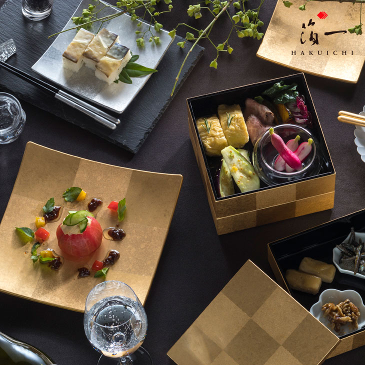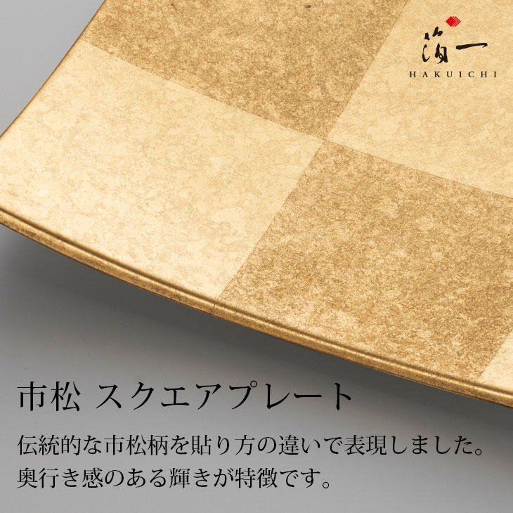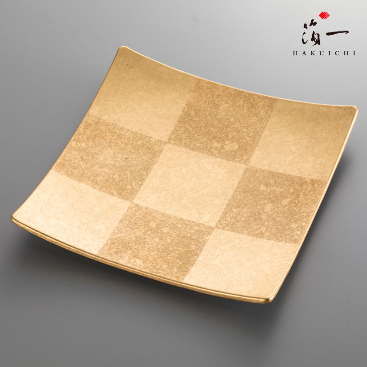 A refined square plate decorated with Kanazawa gold leaf—simple, modern, and expressive in its quiet glow.