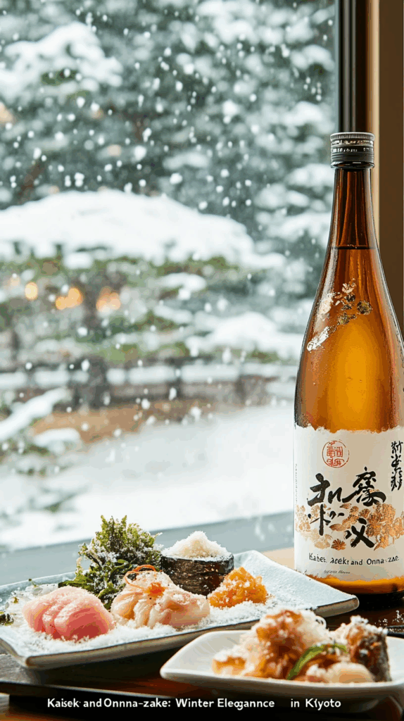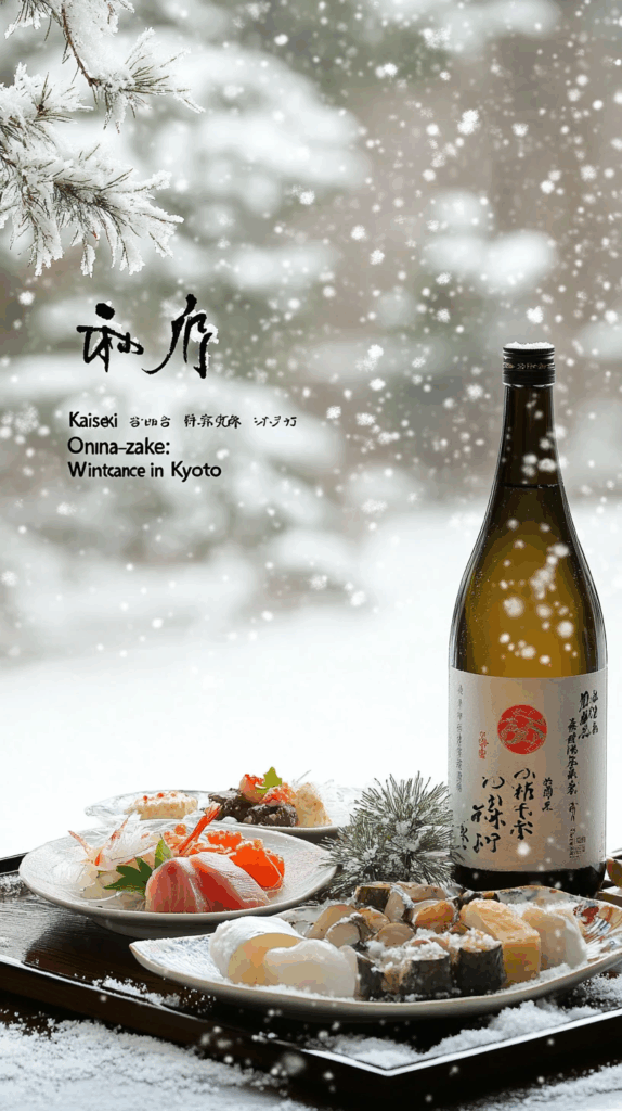 Under the soft hush of a Kyoto snowfall, a glass of sake glows with gentle warmth.Through the shoji window, snow drifts over pines, and the world turns silent.